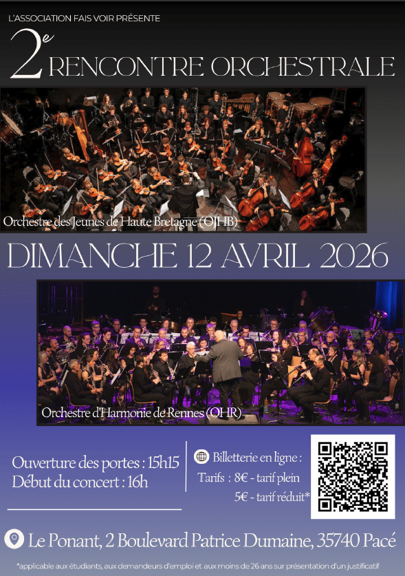 Au programme, l’Orchestre d’Harmonie de Rennes et l’Orchestre des Jeunes de Haute-Bretagne interpréteront chacun leur répertoire avant de se réunir sur scène pour un moment musical exceptionnel réunissant plus de 100 musiciens sur scène.